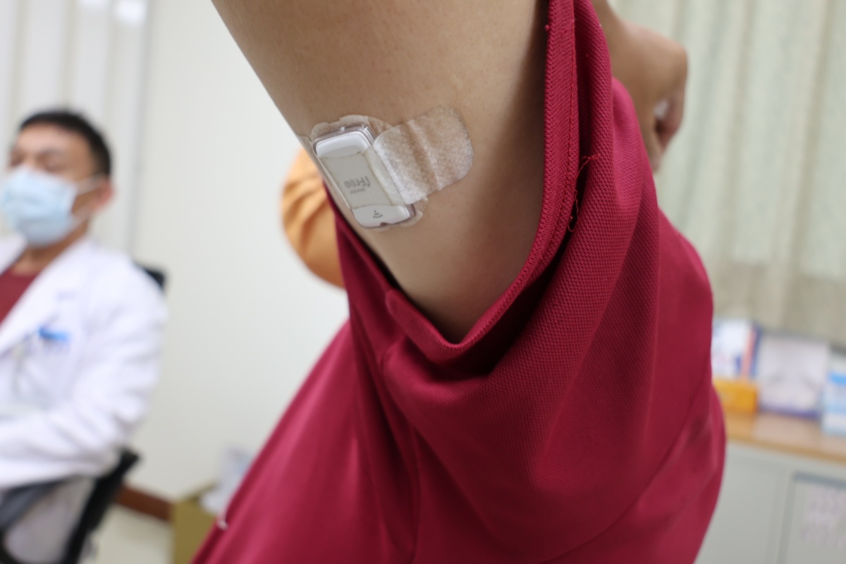 ▲李先生自費在左手臂裝置了連續血糖監測儀,隨時可在手機上觀看血糖值。(圖/彰化醫院提供)