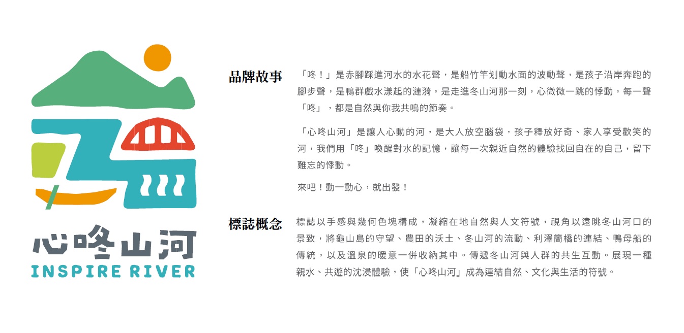 這次發佈的區域品牌「心咚山河」(Inspire River),識別標誌(Logo)巧妙運用幾何色塊與手繪線條,將流域的主要意象悉數收納:最上方的綠色山形代表守望蘭陽的龜山島,鮮紅拱影則是指標地標利澤簡橋,搭配底部的黃色鴨母船弧線與湛藍的冬山河水流,更融入了溫泉與沃土元素。整體設計傳遞出「親水、共遊」的核心理念,象徵冬山河不僅是生命之河,更是充滿驚喜與動力的旅遊首選。