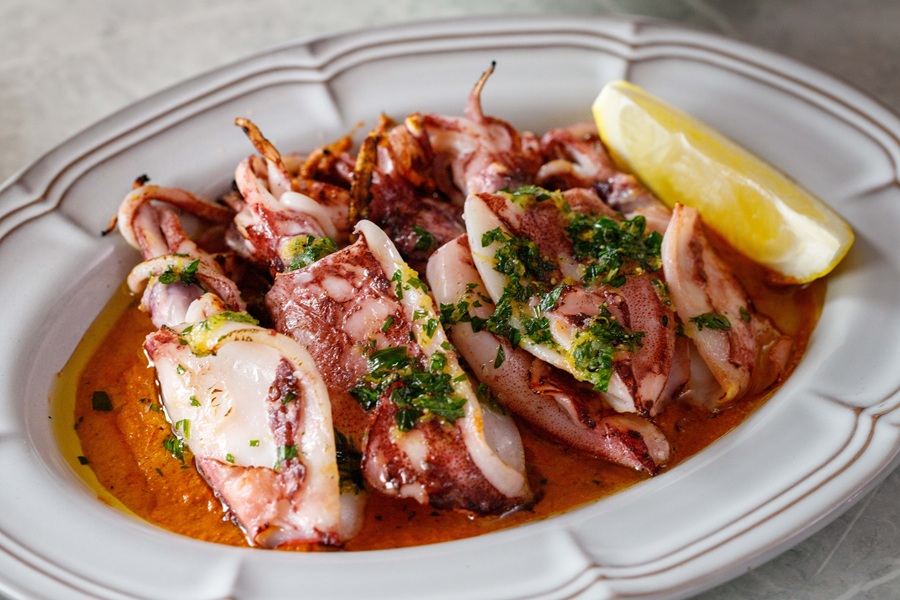 ▲「爐烤小卷、西班牙甜椒堅果醬」表層有著微微焦香、內裡彈嫩有勁,佐以堅果香氣濃郁的甜椒醬,襯托出海鮮的自然鮮甜。( 圖/業者提供 )