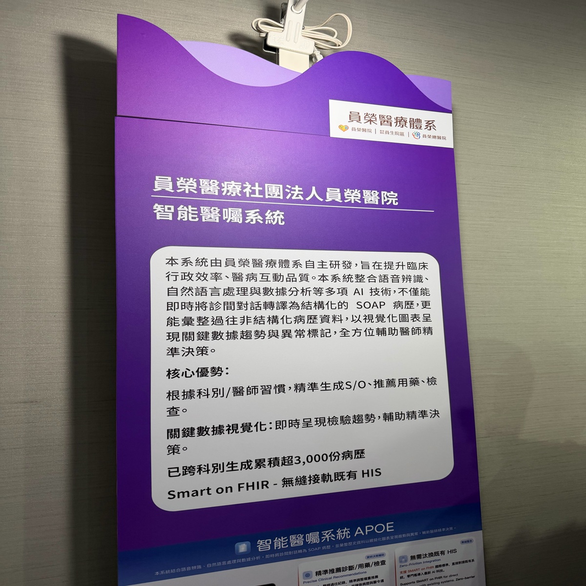 衛生福利部日前舉辦第一屆「臺灣50優良 SMART 應用程式頒獎典禮暨 SMART SUMMIT 國際論壇」,由衛福部莊人祥次長、健保署陳亮妤署長、衛福部資訊處李建璋處長與 SMART on FHIR 標準創辦人暨哈佛大學醫學院教授 Kenneth D. Mandl 共同頒獎,從全國115件參賽作品中評選出50組智慧醫療應用。員榮醫療社團法人員榮醫院以自主研發的「智能醫囑系統」(APOE)脫穎而出,成為本屆獲獎的優秀應用之一,為全台360家地區醫院唯一獲獎,展現員榮在智慧醫療領域的創新能量與落地實力。