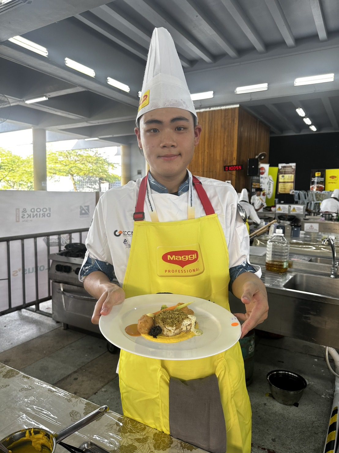 奪下1銀1銅的陳昱安,開學前剛完成在台北米其林一星餐廳的實習,他將實習所學習到的多元香料運用與烹調技法融入賽事,運用「台灣春捲皮」包裹圓鱈,創造出酥脆的層次感,並製作耗時的「荷蘭醬」與「天鵝絨醬(Velouté)」,以多層次的味覺與細膩的質感征服評審。