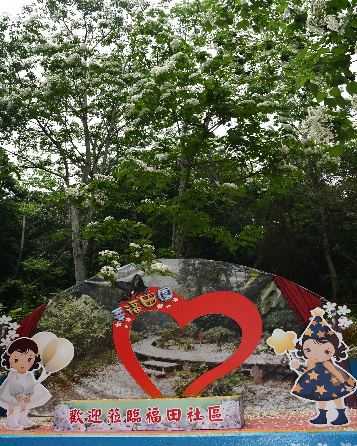 ▲在彰化市福田賞桐生態園區盛開的桐花樹與拍照景點。(圖/記者蕭麗鳳攝)