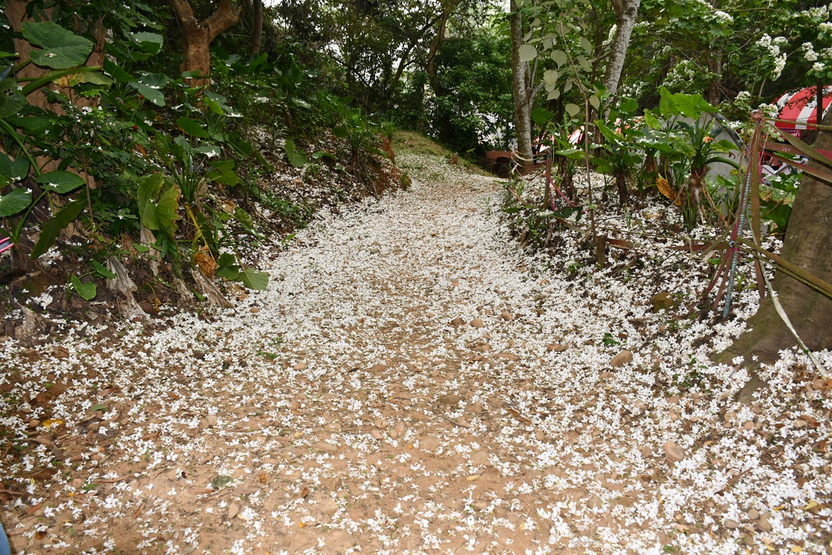 ▲彰化市福田黨桐生態園區內的步道落花繽紛美景如畫。(圖/記者蕭麗鳳攝)