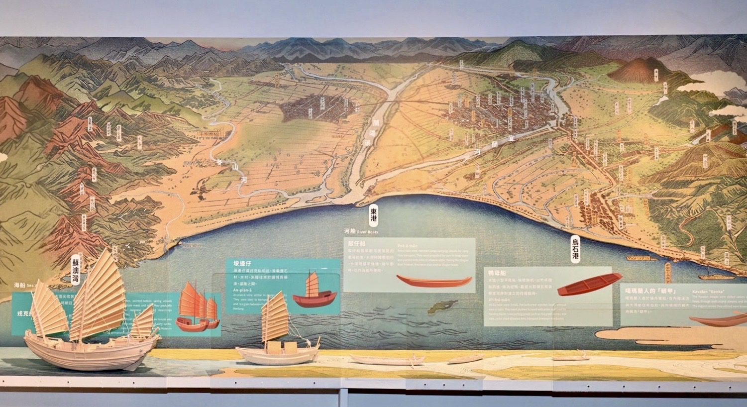 林茂盛指出,特展最吸睛的重量級展品是「雕刻葛瑪蘭」木雕巨作,由喜互惠公司長期支持的宜蘭木雕大師陳萬松在27年間,以千年檜木刻劃出早期宜蘭的地景文化及生活樣貌;還有五結清水祈安宮以戎克船為原型而打造的王爺船、曾航行於蘭陽平原溪河港道的民間舢舨舟船;清代烏石港口的防禦古砲管及禁止索賄古石碑;早期航運的貿易、生活及宗教等物品以及極為罕見的純金「頭城搶孤紀念金牌」等,展品驚豔登場,展現豐富多樣的港口文化。