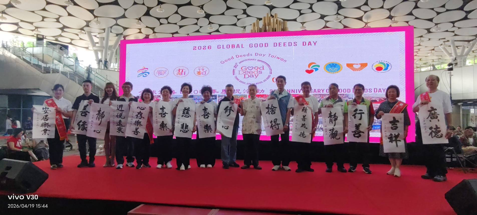 本次特別結合藝術與文化展演,將抽象的「善」轉化為具體而深刻的感動。由高雄市雅韻合唱團演唱〈感恩的心〉與〈祝你幸福〉,以溫暖旋律傳遞關懷;書法家現場揮毫「善」字,象徵善念的凝聚與延續。