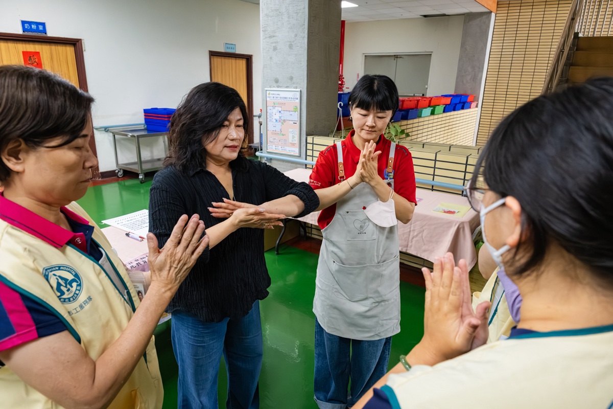 ▲張麗柔董事(中)透過精油香氣為身邊夥伴手掌畫愛心,傳達「為愛行動,因愛富足」。(圖/彰基提供)