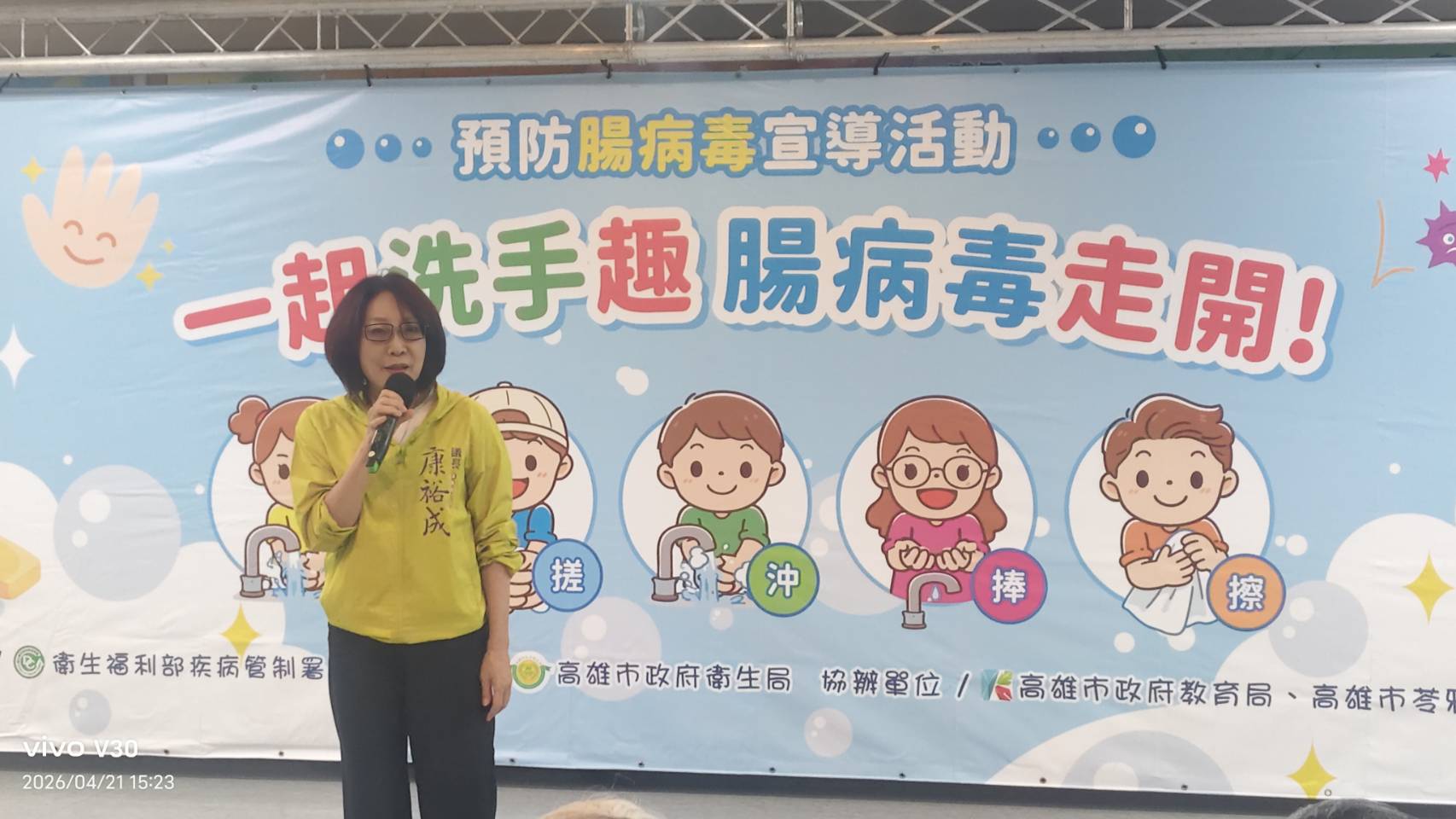 隨著氣溫逐漸升高,腸病毒也即將進入流行期。為強化校園防疫意識與學童正確衛生習慣,高雄市政府衛生局結合教育單位,走入校園推動防疫宣導活動。今(21)日於苓雅區凱旋國小舉辦「一起洗手趣,腸病毒走開」活動,透過寓教於樂的方式,讓學童在歡樂中學習防疫知識。市長陳其邁也親自到場,以唱跳洗手歌帶動全場,展現市府對學童健康的高度重視。