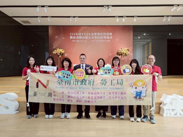 勞工局持續深化人才培育品牌,114年再度榮獲TTQS金牌肯定,為全國唯一連續15年獲得金牌的地方政府職業訓練機關;大台南總工會亦連續13年蟬聯金牌,成果亮眼。