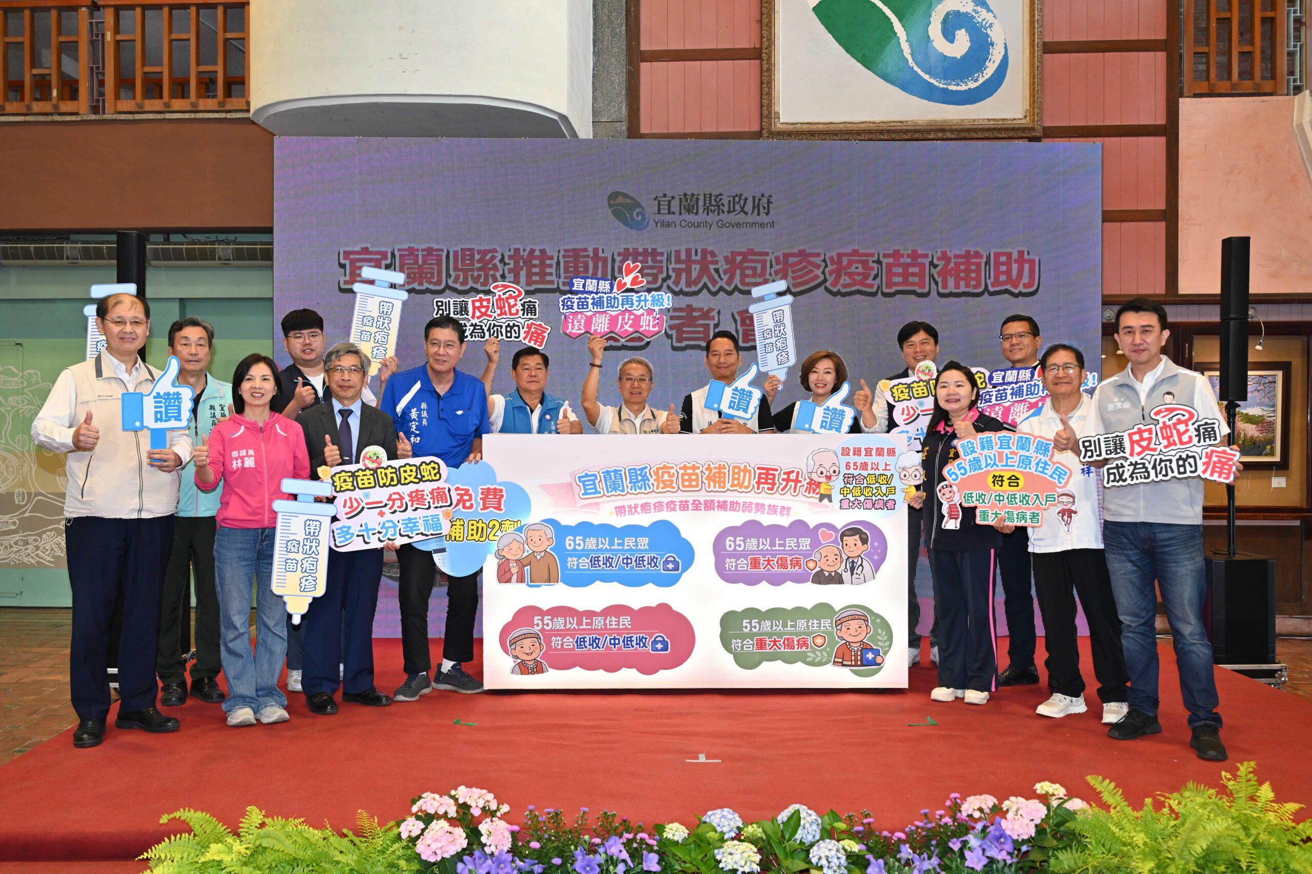 林茂盛強調,為持續提升縣民健康防護力,宜蘭縣政府積極推動各項疫苗補助政策,從長者到嬰幼兒,「全齡照護、顧老顧小,逐步到位」。自111年起縣政府率先補助65歲至70歲以上長者公費接種肺炎鏈球菌疫苗,以有效降低重症與死亡風險;113年再補助嬰幼兒口服輪狀病毒疫苗,減輕家庭照護負擔,守護幼兒健康成長;115年更規劃推動帶狀疱疹疫苗補助,進一步強化中高齡族群健康防線。透過分齡、分眾的補助策略,逐步建構完善的免疫防護網。如此不僅降低疾病發生率,也減輕醫療體系負擔,並展現縣府對公共衛生的重視與持續投入,讓更多縣民受惠,朝向守護全齡健康再邁進!
