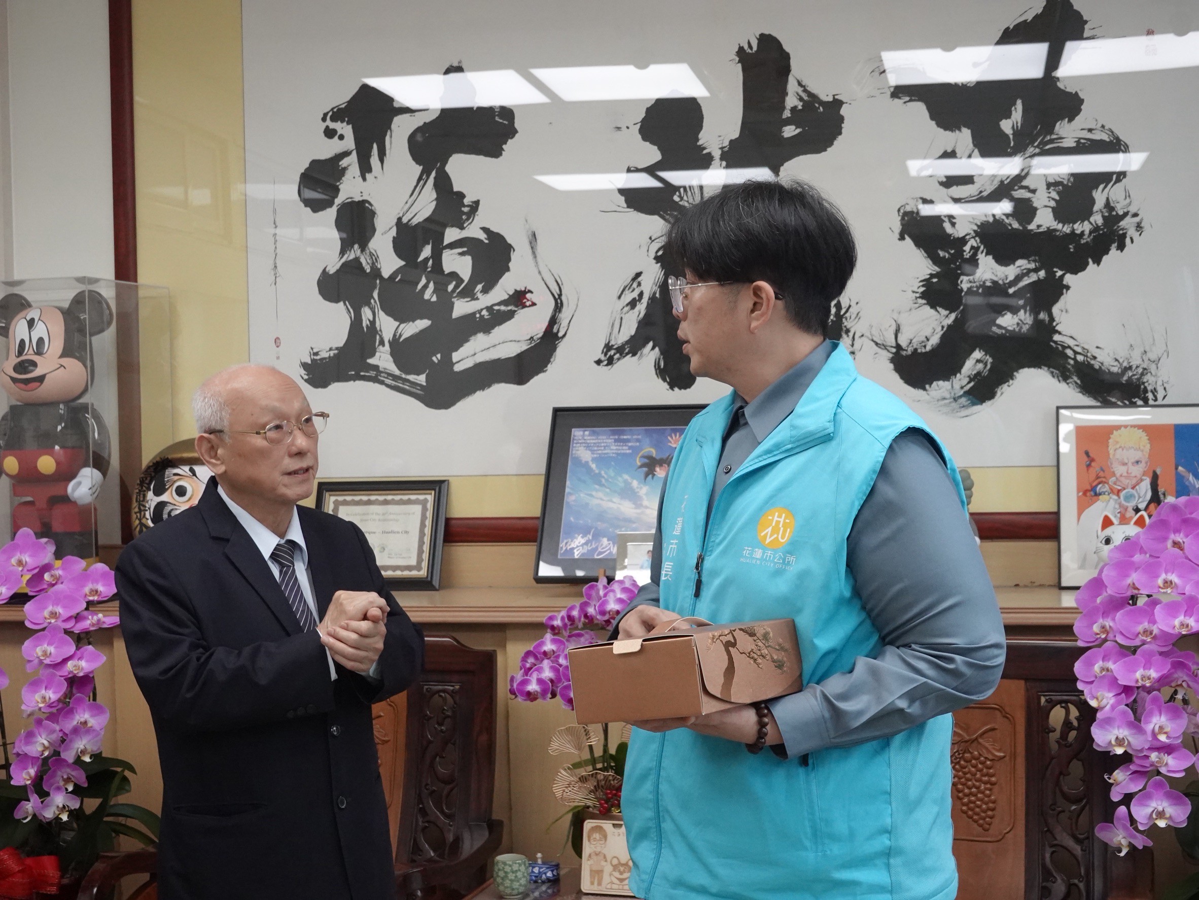 慈濟基金會成立60周年,公傳志工黃義峰、陳玉萍等人日前到花蓮市公所,致贈象徵祝福與圓滿的壽桃,市長魏嘉彥祝福與肯定慈濟長年深耕公益、無私奉獻,為社會帶來溫暖與正向力量。