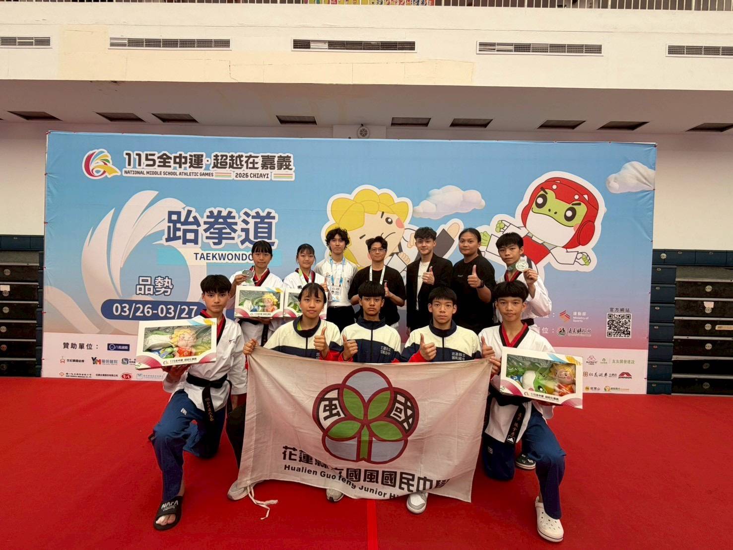 ▲國風國中在跆拳道項目表現優異,總教練陳廖霞(後中)同感振奮。