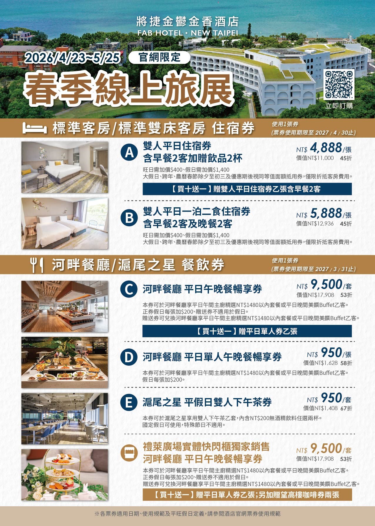 住宿券部分推出雙人平日入住含早餐方案,每張4,888元起,並加贈飲品,另有一泊二食方案每張5,888元,直接包含雙人早餐與晚餐,讓旅客在館內即可享受完整度假體驗;餐飲券則涵蓋河畔餐廳平日午晚餐通用券與單人優惠券,以及滬尾之星雙人下午茶券,無論是想要享受豐盛自助餐,或是在高樓景觀空間品味下午茶,都能依照需求彈性選擇,提升整體旅遊的自由度與豐富性。
