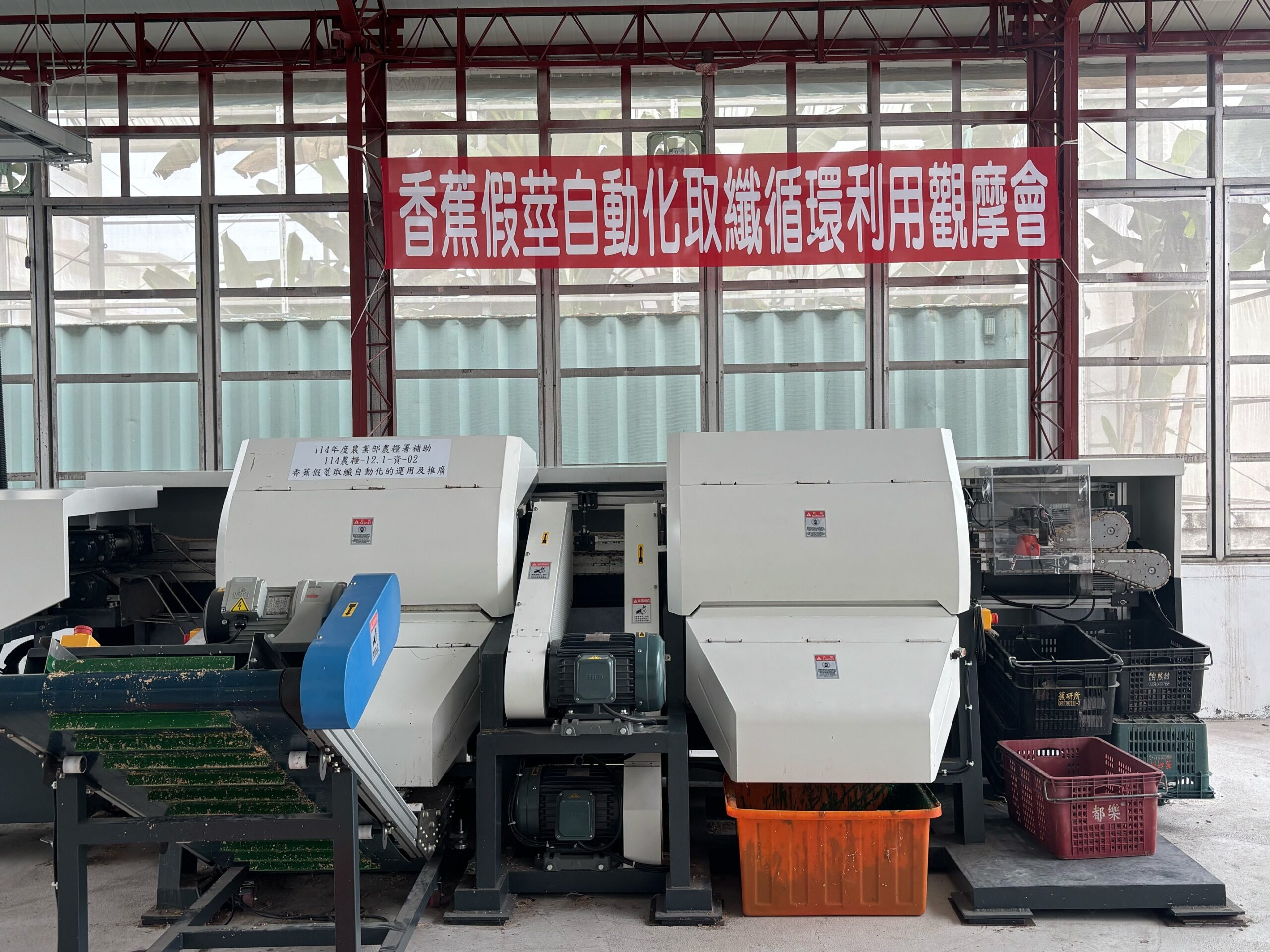 農糧署說明,臺灣香蕉收穫面積約14,000公頃以上,農友們在採收香蕉後,往往留下更大量的香蕉假莖副產物,過去常被視為廢棄物,然而香蕉假莖富含可循環利用且深具減碳效益之天然纖維,未善加利用殊為可惜。為了建立香蕉假莖循環利用模式,該署與蕉研所合作開發適當的田間栽培管理模式及假莖省工採收方法,並且輔導設置首座區域型香蕉假莖自動化取纖循環場,透過自動化取纖設備,將能快速且穩定生產高品質的香蕉纖維,有助於提升香蕉假莖纖維織品之能見度。
