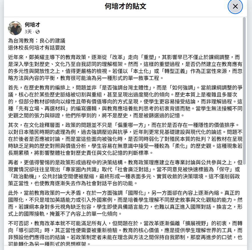 近日,,退休校長何培才於Facebook發表〈為台灣教育:良心的建議〉一文,直指當前教育政策在歷史敘事、文化詮釋與決策機制上的多重問題,引發社會關注。其論述鋪陳嚴謹、批判力道鮮明,展現一位長年深耕教育者的憂思。然而,當這樣的批評進入公共領域,值得檢視的,不僅是其指控是否成立,更在於其指向是否精準、論述是否平衡,以及是否能提出具體可行的建設性方向。