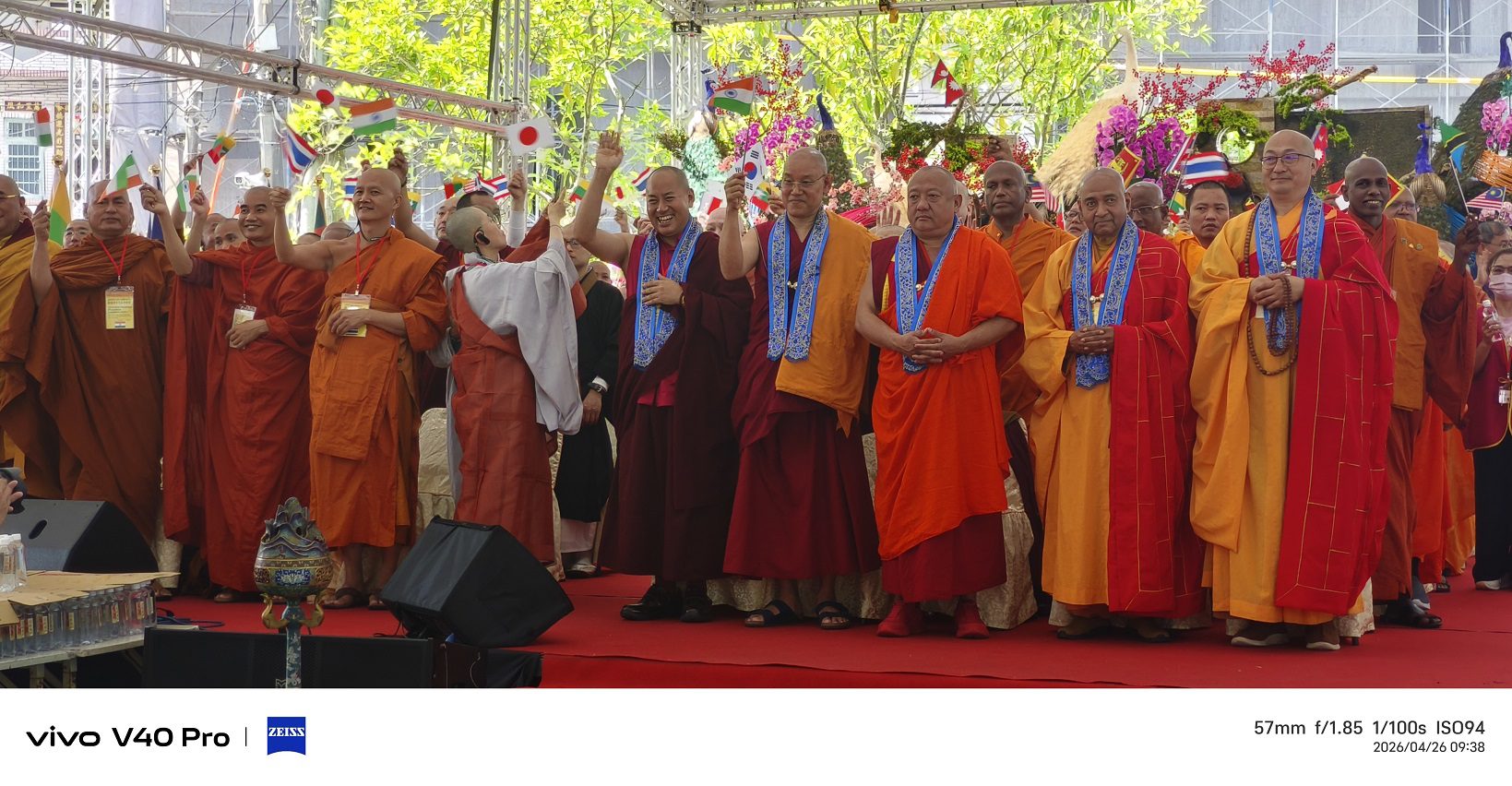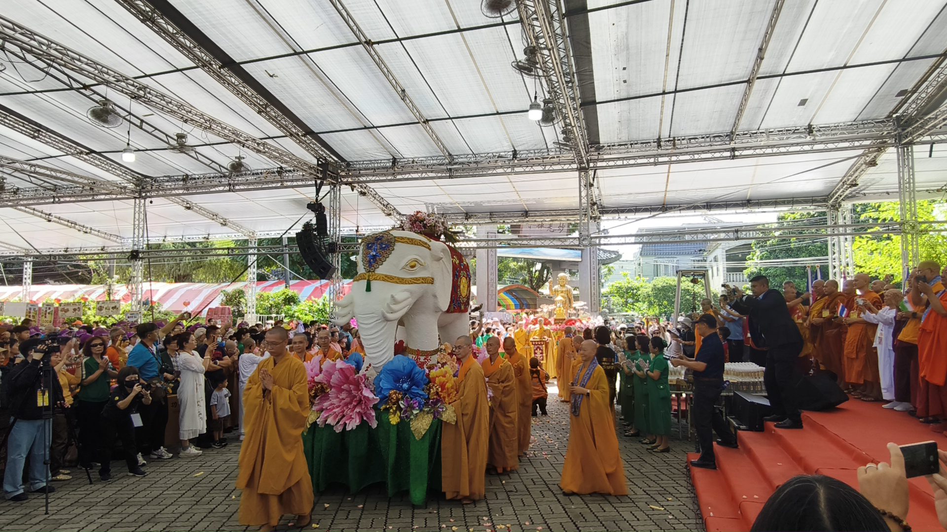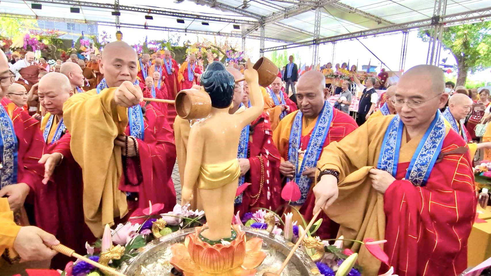本次浴佛大典融合宗教儀典與文化展演,展現台灣多元宗教並存的珍貴樣貌。活動由各宗教團體與文化隊伍迎佛進場揭開序幕,原住民文化藝術團、安息日會、天主教會、基督長老教會等跨宗教代表共同參與,象徵宗教間的尊重與包容。慈明高中學生手持佛旗迎風揮舞,摩耶夫人、太子聖像及六牙白象莊嚴登場,為佛誕盛典增添繽紛意象與文化深度。來自世界各地的僧侶代表紛紛以手機紀錄此一難得場景,對台灣宗教多元共融深感讚嘆。