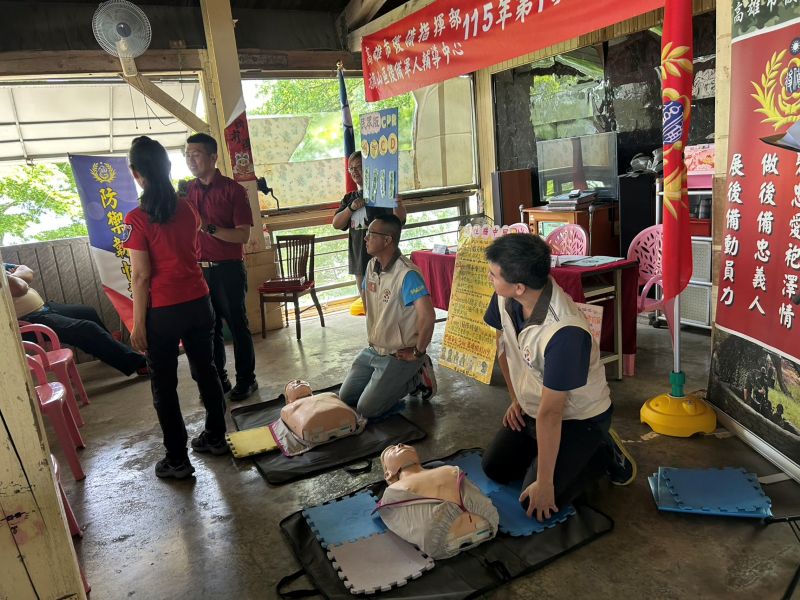 高雄市後備指揮部伍上校蒞臨指導,與會來賓包括高市政府兵役處長謝健成及高雄市榮民服務處劉社工等。會中由旗山消防中隊鍾隊長進行 CPR急救與哈姆立克法(噎食急救)常識分享,透過實務講解與示範,讓與會人員更了解急救的重要性,並提升在地防災與緊急應變能力。義消的專業訓練與經驗,成為軍地合作中不可或缺的一環。