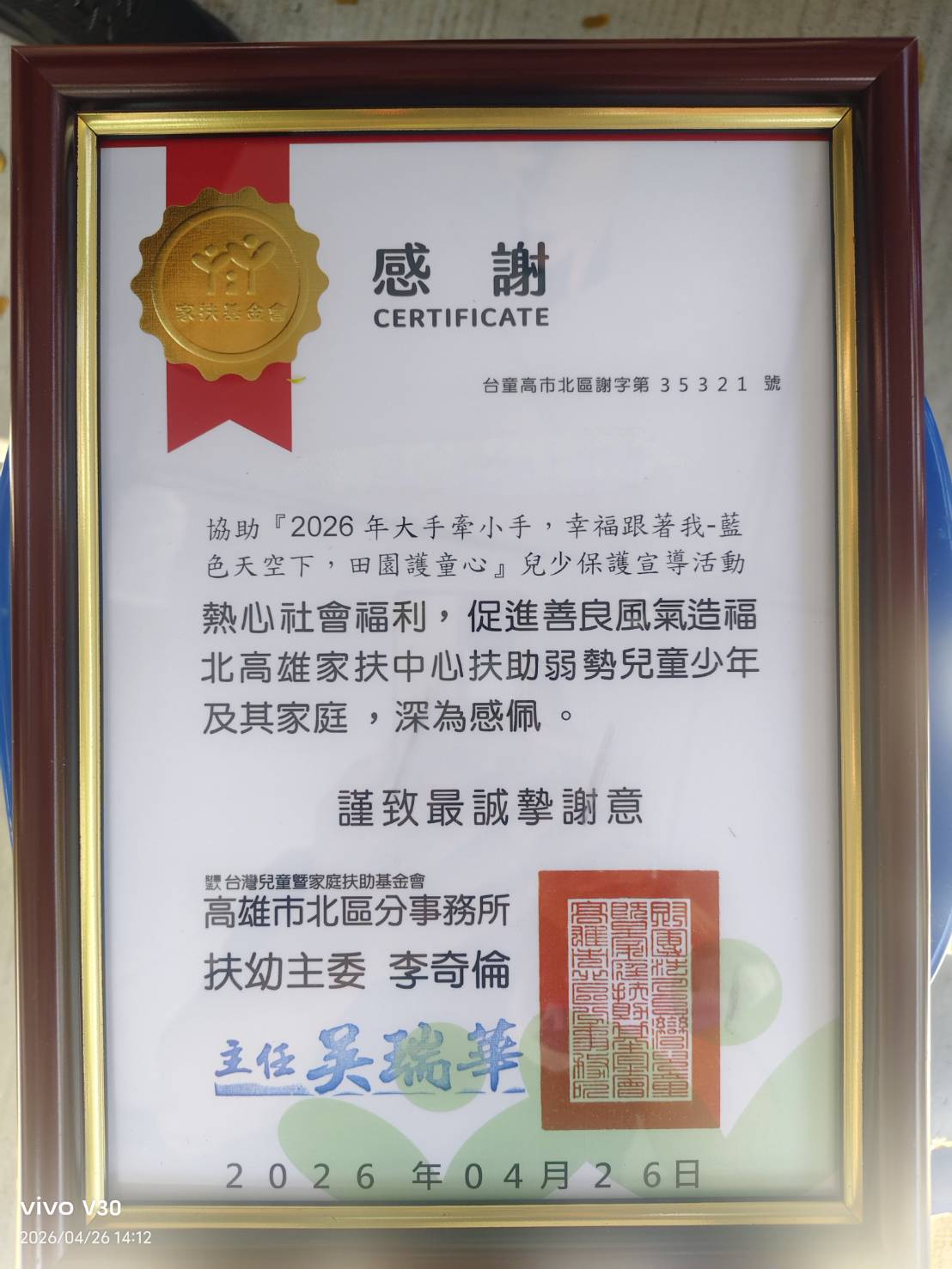 本次活動獲得眾多企業與公益團體支持,包括信義房屋股份有限公司、燦坤實業股份有限公司、財團法人高雄市鳳山天公廟、高雄市預防兒童失蹤協會、財團法人高雄市私立育世社會福利慈善基金會與社團法人中華民國文化永續發展協會等,展現公私協力的力量。