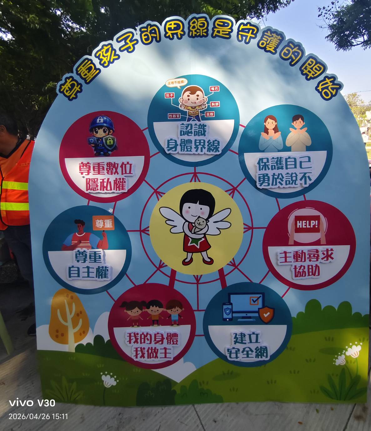 此次活動以「大手牽小手 幸福跟著我 藍色天空下 田園護童心」為主題,吸引上千名社區親子熱情參與。現場設計多項互動闖關遊戲,將「網路安全」、「身體界線」與「自我保護」等概念融入其中,讓孩子在遊戲中學習辨識風險。