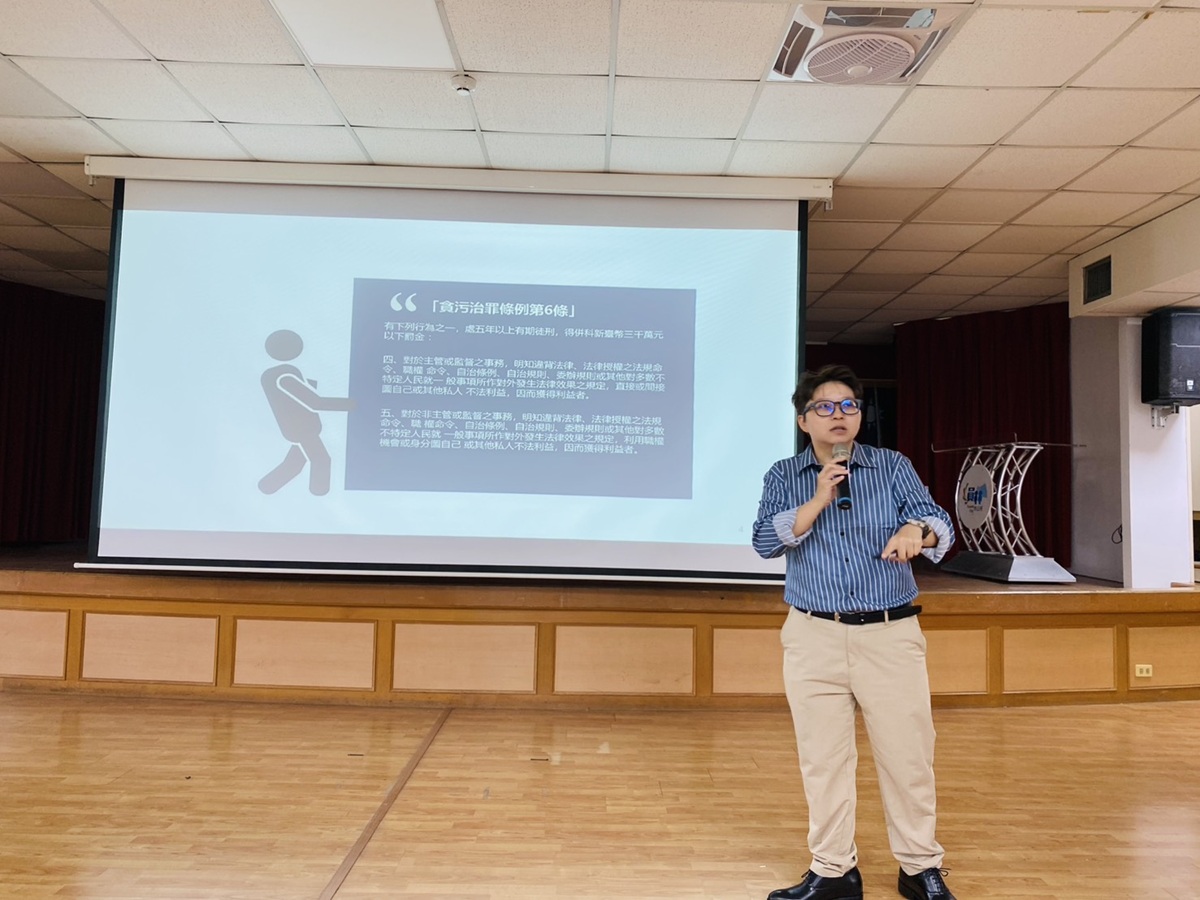 黃檢察官亦於課堂中一再申明「酒駕」的嚴重後果,於課堂中宣導「開車不喝酒、酒後找代駕」的觀念。同時也引用其近期偵辦的「臺中清潔隊員收賄案」為例,提醒公務同仁在行使職權時應時刻潔身自愛。針對即將到來的地方選舉,也詳細解說歷年常見的賄選手法、圖利罪與利益衝突案件構成要件,透過具體案例分析,協助與會人員釐清過往在執行職務時可能遇到的法律疑義,避免誤觸法網。