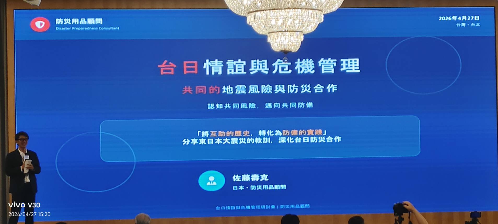 日本防災專家佐藤壽克分享多起重大震災經驗,包括東日本大地震與能登半島地震,指出災害損失的大小,往往取決於事前準備程度。他提出「72小時自助原則」,強調災後前三天是救援最吃緊的關鍵期,每個人都應具備基本生存能力,包括每日3公升水、三餐食物及如廁需求的準備。其中「簡易廁所」更被點名為關鍵物資,直接影響避難所衛生與秩序。