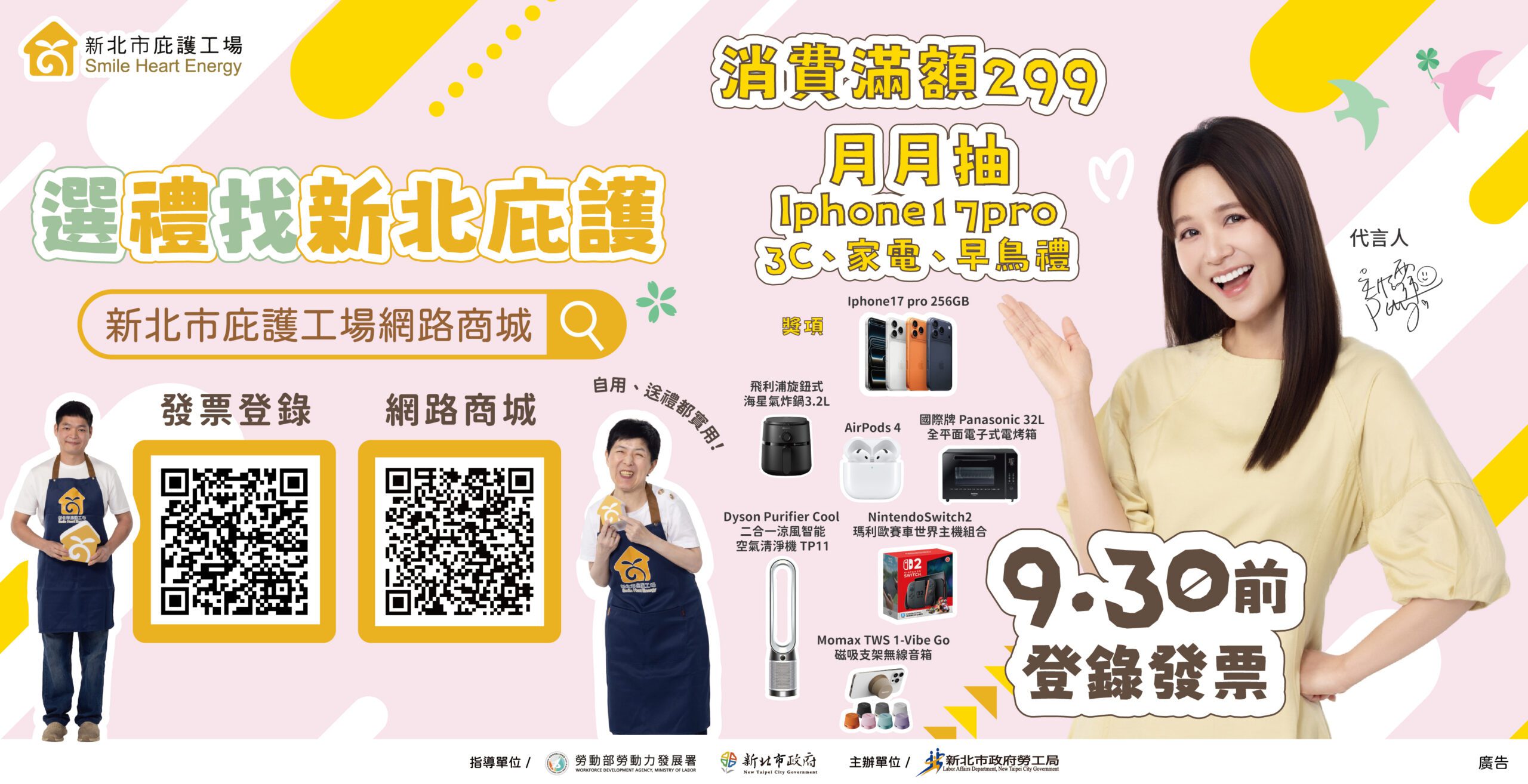 新北市庇護工場用最純粹的匠心,打造多款母親節特色商品,手作糕餅、香氛手工皂、客製化紀念品應有盡有。每一份產品的背後,都蘊藏著身心障礙員工的努力與用心,絕對是送給媽媽最具溫度的禮物。為了回饋消費者的支持,新北市勞工局推出「消費滿額299月月抽iPhone17 Pro」。凡於115年9月30日前,於新北市庇護工場實體通路或網路商城單筆消費滿299元,即可憑發票至專屬活動網站登錄參加抽獎。活動獎項總價值高達50萬元以上,每月將抽出幸運兒,大獎包含最新款iPhone17 Pro 256GB、Dyson智能空氣清淨機、Nintendo Switch2、飛利浦氣炸鍋及AirPods4等豪華3C家電。每月更提供限量早鳥禮「PayEazy享樂券」,鼓勵大家越早消費、中獎機會越高!