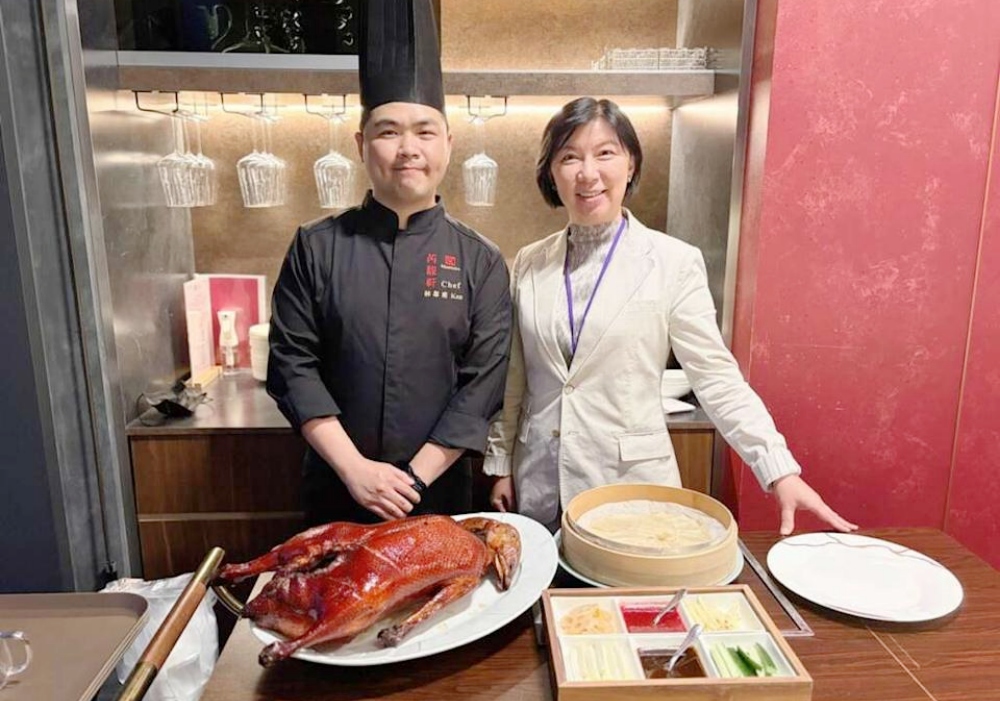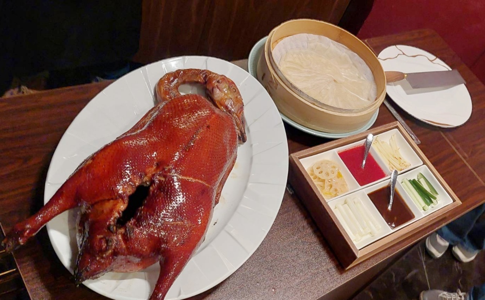 芮馥軒 Renfinea 的招牌「爐烤片皮鵝」:選用上等雲林白羅曼鵝種,以秘製醬料醃漬並精準控溫爐烤,外皮金黃酥脆、肉質嫩滑多汁。專業師傅現場演示「片鵝」藝術,讓客人在入口前先行體驗視覺饗宴,將一場美味的序幕,從燙皮收緊的瞬間拉開帷幕成為老饕與社群創作者的首選。