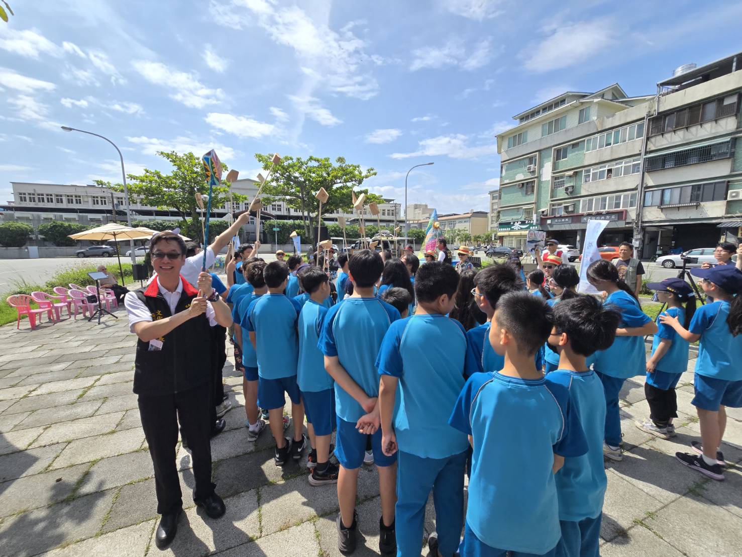▲鑄強國小校長孫東志(後中左)以參加「魚花處處開」活動的師生為傲,藝術家宋政偉(後中右)是幕後重要推手。(圖/范振和攝,下同)