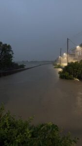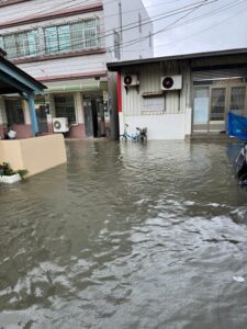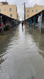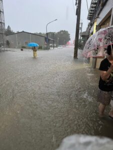 街道成河 志工與救援送暖不間斷,在台南沿海與嘉義朴子地區,街道積水成河,居民涉水返家查看情況。住戶緊急用沙包與木板封堵門口,防止進一步淹水。救災人員冒雨協助撤離長者與行動不便者,志工團體也主動出動,分送熱食與生活物資,為災民帶來一絲安心與溫暖。