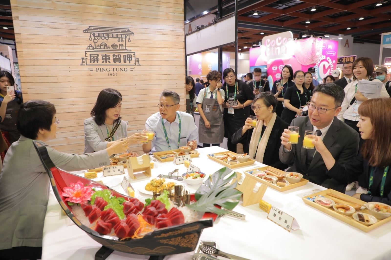 開幕重頭戲由「鮪魚刀工秀」震撼登場,專業師傅現場現切鮪魚生魚片,展現屏東漁業強大實力,吸引大批民眾駐足、拍照並試吃品嚐,展現屏東漁產第一線的真功夫。