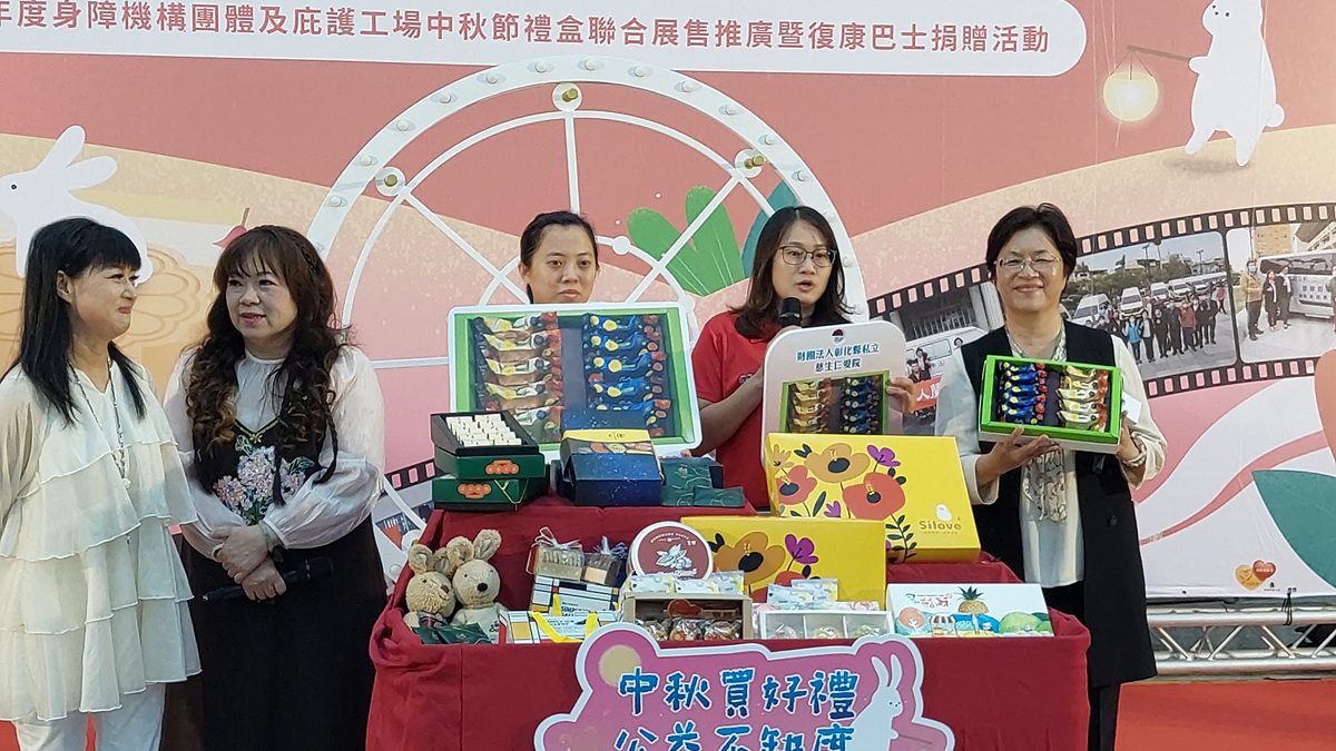 中秋佳節即將來臨,為協助縣內身障機構團體及庇護工場拓展產品通路,彰化縣政府今(15)日上午於彰化縣平和國小活動中心舉辦「中秋買好禮-公益不缺席」中秋禮盒聯合展售推廣暨復康巴士捐贈記者會,縣長王惠美與會,並特別邀請藝人南方二重唱一同站台,攜手為身障單位的產品做推廣與宣傳。活動結合公益禮盒展售與交通資源挹注兩大主軸,期望凝聚社會力量,共創友善、多元支持的生活環境。