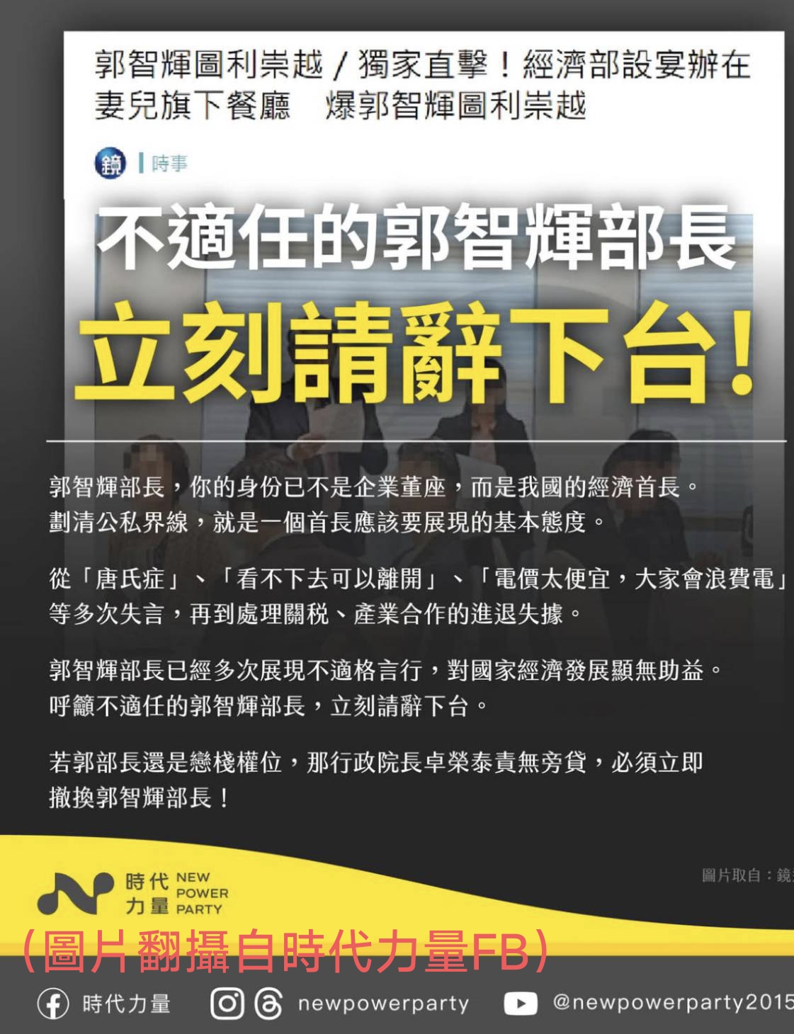 【記者唐嬋娟/台北報導】 經濟部郭智輝部長「在關稅公告當日停留宴席三小時」,侯漢廷因查證不夠嚴謹向郭智輝道歉。郭智輝卻持續追究其妨害名譽不撤告,寧揹司法追殺惡名,官告民似乎成為風氣。郭智輝,已經是古稀之年,雖是官,還是爭議頗多的公僕,本該受民代監督,為民發聲是民代的職責。