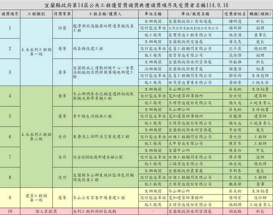 ▲宜蘭縣第14屆公共工程優質獎頒獎名單。(資料來源/宜蘭縣政府)