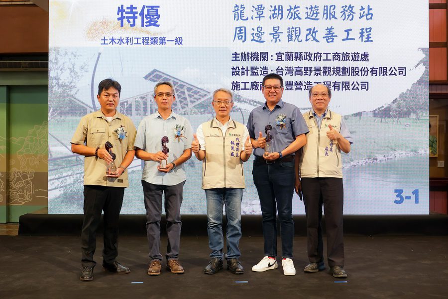 象徵宜蘭縣公共工程界最高榮譽、今年邁入第14屆的「公共工程優質獎」,16日在縣政府大廳舉行頒獎典禮,共有9件工程及1位個人獲獎,由代理縣長林茂盛頒獎表揚;其中縣政府工商旅遊處主辦的龍潭湖旅遊服務站周邊景觀改善工程,榮獲「特優」。