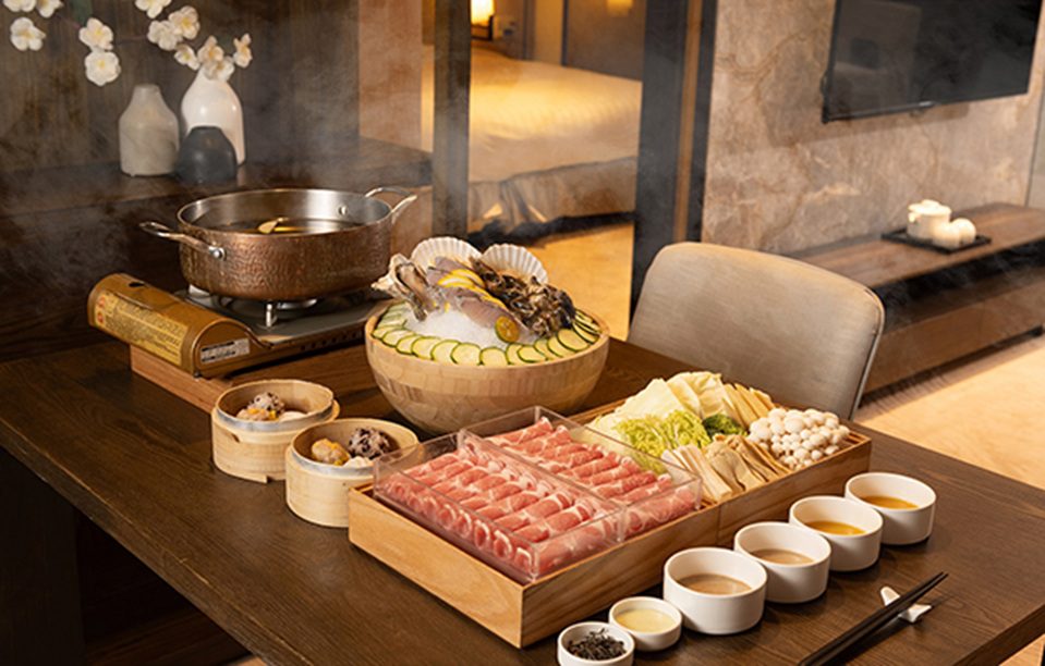▲客房泡湯專案搭配小蘊補火鍋,嚴選在地海陸食材與滋養湯底。( 圖 蘊泉庄提供 )
