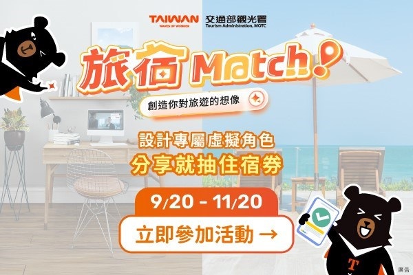 另外9月20日至11月20日期間亦舉辦《旅宿 Match!》網路互動活動,只要依照指引於於遊戲畫面中,挑選專屬的虛擬角色,自由選擇五官、服裝、配件及表情等元件,即可生成結合個人形象的角色,由系統自動媒合一間符合角色風格的合法旅宿背景,模擬入住旅宿情境的影像,完成一張「旅宿 Match!」專屬結果圖,再填入抽獎資訊並分享給2位好友,即完成活動程序與抽獎資格,獎項包含合法旅宿住宿券、餐券、下午茶券、溫泉券等超過百項好禮,天天參加累積更多抽獎機會!