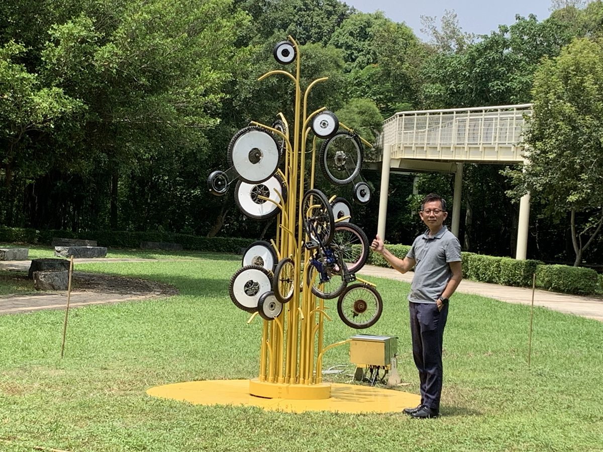 ▲設計學系副主任賴建源獲邀創作裝置藝術作品「光之智慧」,放置於八卦山天空步道7號入口,展現自行車產業與設計藝術的交會。(圖/大葉提供)