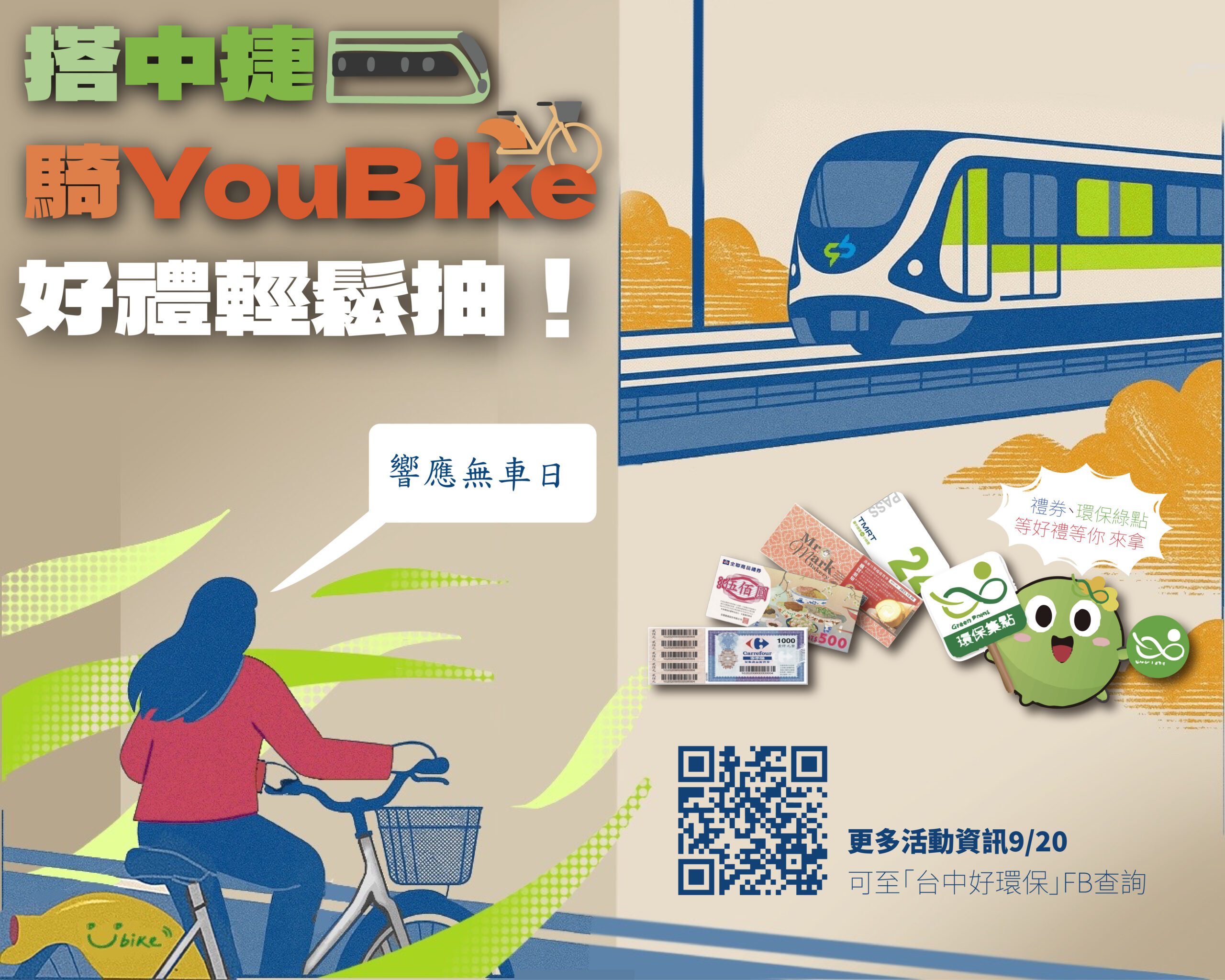臺中市政府環保局與台中捷運股份有限公司及微笑單車股份有限公司共同響應聯合國倡議每年9月22日為「國際無車日」(World Carfree Day)推動綠色交通宣導活動,自今年9 月 22 日起至 10 月 30 日 推出「搭中捷、騎 YouBike 好禮輕鬆抽」活動,鼓勵市民增加搭乘大眾運輸工具或騎乘自行車通勤,以促進台中低碳永續發展。