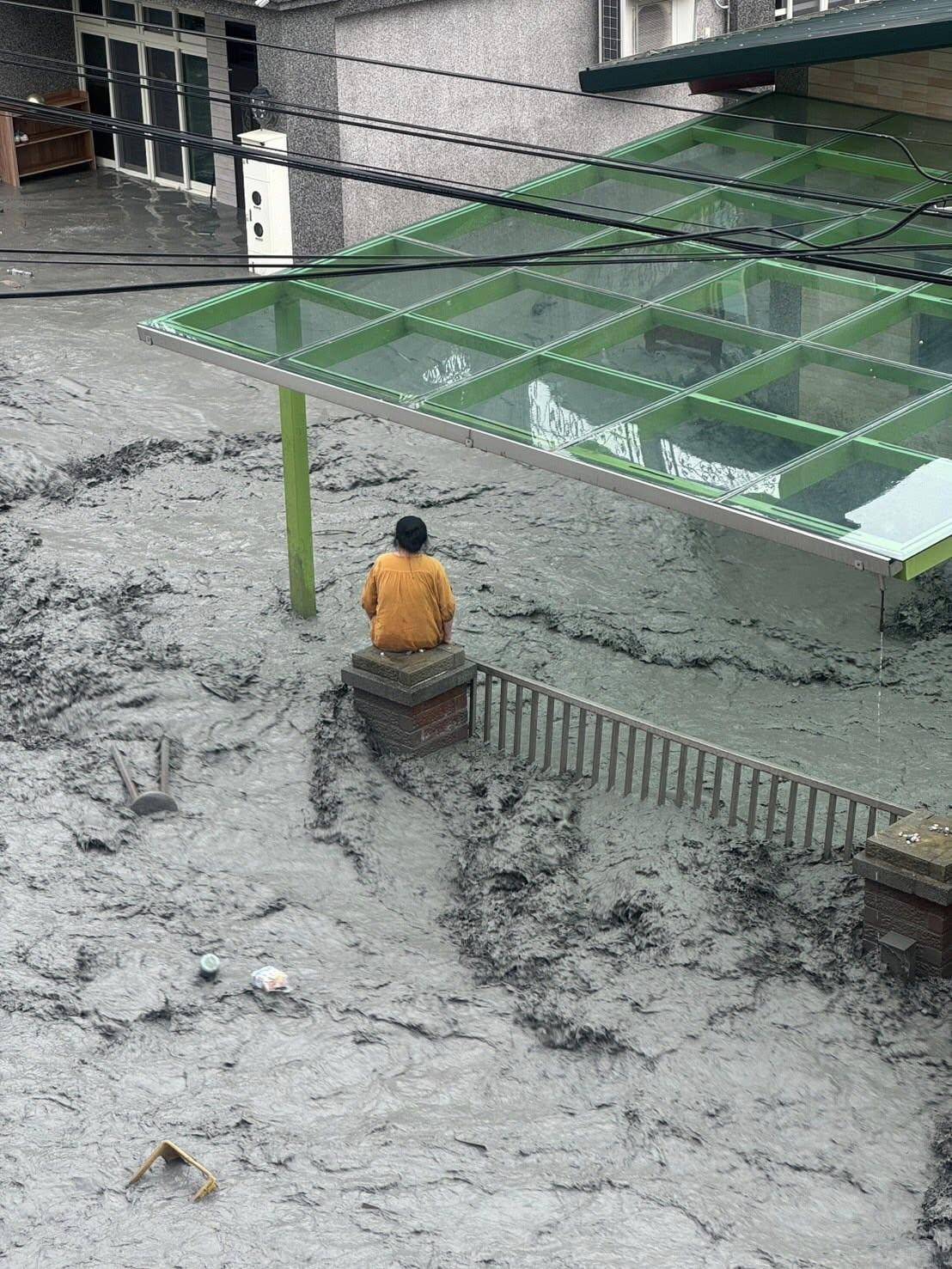 ▲ 光復鄉馬太鞍溪堰塞湖溢流釀災,一名婦人坐在石墩上待援。(圖/讀者提供,下同)