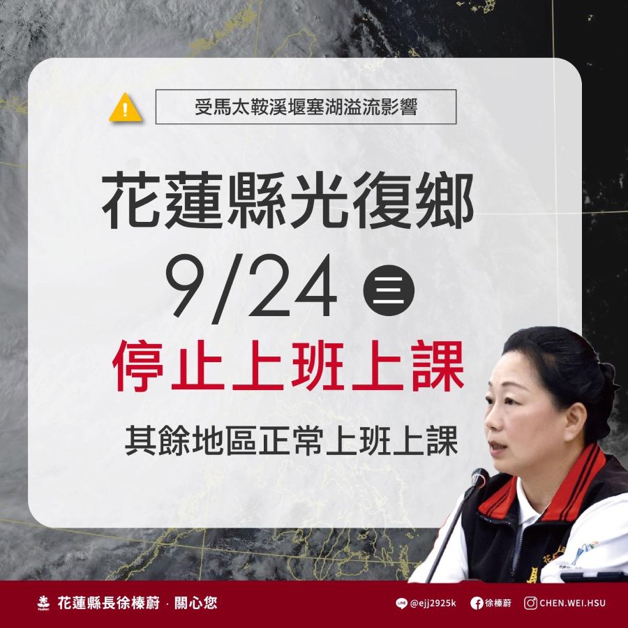 花蓮縣政府則宣布,受堰塞湖兩波溢流影響,光復鄉需災後復原及整理家園,9/24(三)停止上班、停止上課,其餘地區正常上班上課。另外根據行政院人事行政總處公告,臺東縣海端鄉利稻村、臺東縣海端鄉利稻村、霧鹿村9/24也停班課。