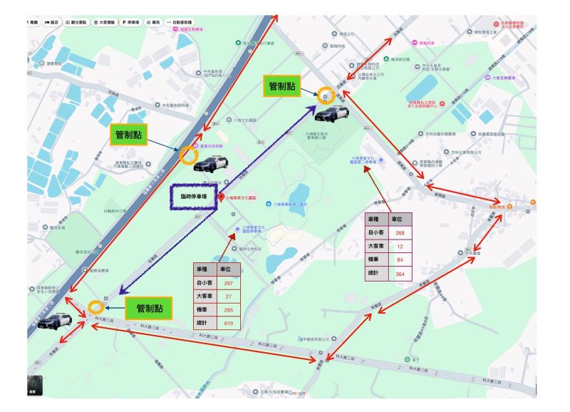如果這2處停車場都已爆量,且車流持續湧入信義路,內埔警分局會與園區人員,將共同管制、封閉「科大、信義路口」、「建興、信義路口」,以及「園區大門延伸至國三橋下路口」,並禁止各型車輛進入(只出不進;不含屏東客運公車)園區內,另封閉部分「信義路段」做為臨時停車場,以避免車流回堵,同時間也會立即通報警廣周知所有駕駛朋友。