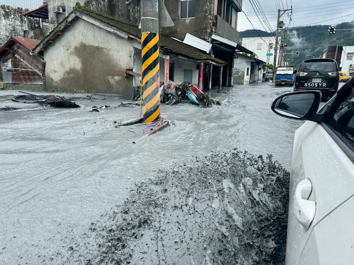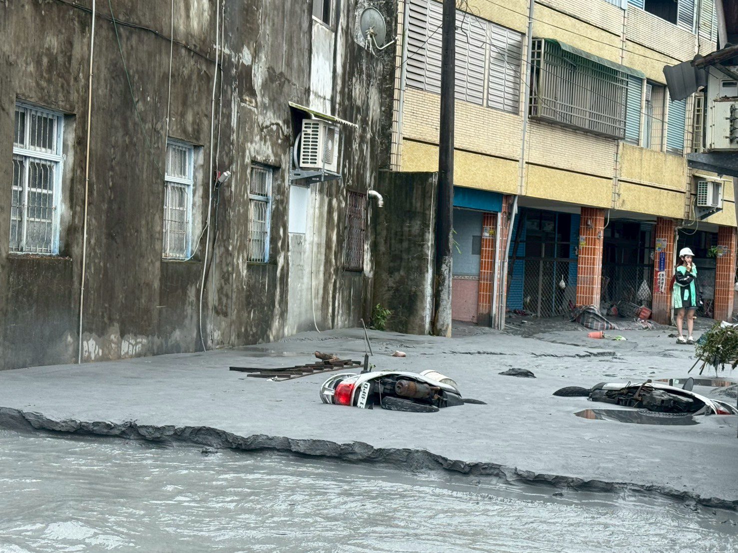 ▲光復鄉市區道路滿是厚厚的黑色泥流,覆掩多部機車,令人不忍卒睹。