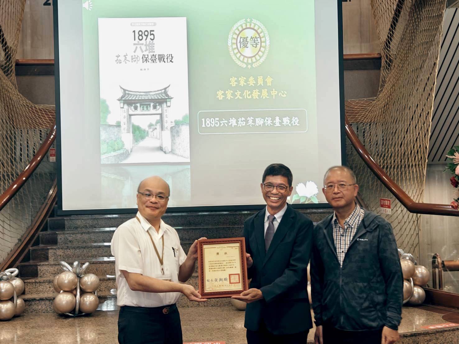 【記者戴英薇/內埔報導】 今(25)日於國史館臺灣文獻館舉辦的「114年獎勵出版文獻書刊」頒獎典禮中大放異彩,共有6件出版品獲獎,其中《1895六堆茄苳腳保臺戰役》榮獲推廣性文獻書刊優等獎,另有5件佳作,展現客發中心深耕客家史料與文化研究的成果。