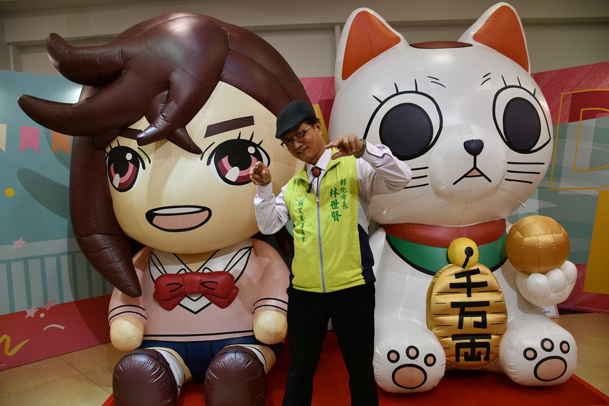 ▲林世賢市長在中友百貨台中店新設的快閃店和動畫《膽大黨》角色合影。(圖/彰化市公所提供)