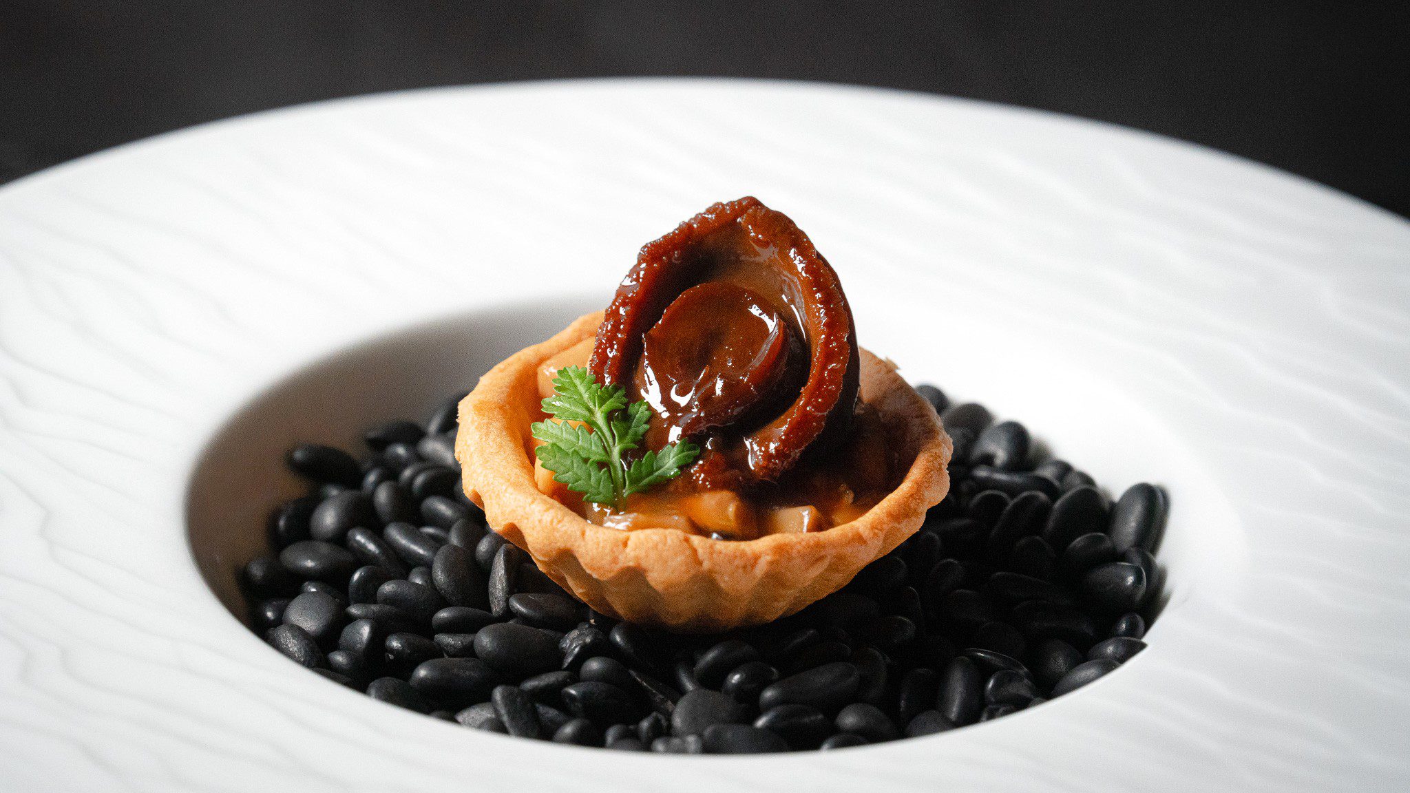 鮑汁海參荷葉飯選用海參、瑤柱與雞肉,以粵式鮑汁文火慢燜,醬汁鹹鮮濃郁、層次豐富,完整包覆食材。海參吸飽醬汁後,口感柔潤富彈,入口膠質感豐盈,與瑤柱、雞肉交織出鮮香深厚的底蘊。主廚再將燜料與炒至粒粒分明的泰國香米拌勻,包裹於荷葉中,以蒸氣慢煮,使荷葉清香緩緩滲入米飯,米粒溫潤飽滿,醬香與荷香交融,入口細膩芬芳。