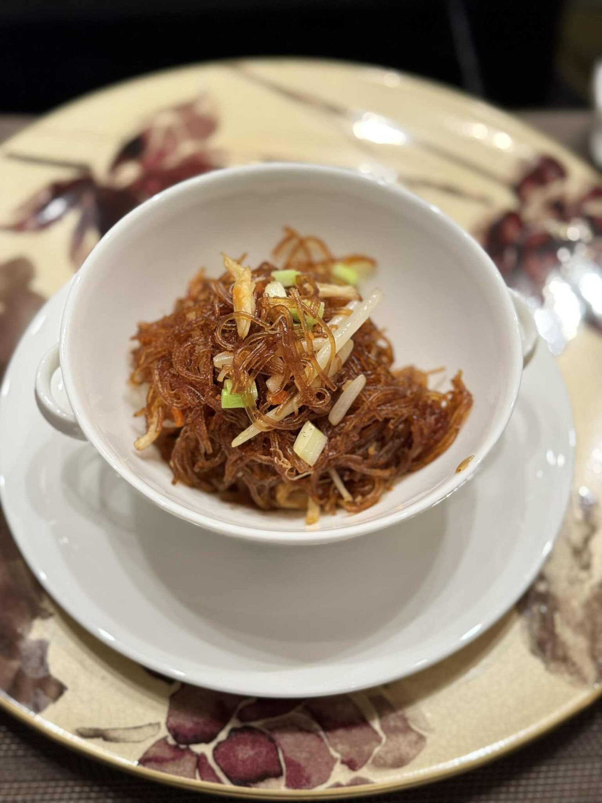 有別於螞蟻上樹所使用的濕軟、油潤冬粉,「鮮蟹肉乾逼粉絲」採粵菜經典技法「乾逼」使冬粉層次分明、乾香有致。展現台灣風土與粵菜技藝融合之下,對風味控制的極致掌握。陳泰榮師傅將台灣當季蟹膏與蟹肉入鍋細火收乾,釋出濃郁海味,再將經過台灣西岸強烈日曬與海風吹拂,自然晾曬而成的新竹手工冬粉投入鍋中,一同收汁。最後拌入蝦籽提鮮,讓口味更具層次,海味綿延不絕。入口的那一刻,冬粉如魚翅般柔韌滑彈,吸盡鮮蟹精華,纖細卻有存在感。