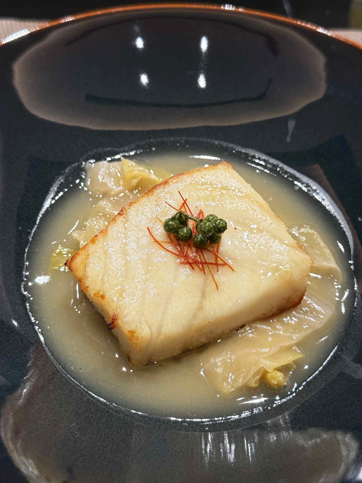 野生犬牙南極鱈魚選用富含油脂的犬牙南極鱈魚,炙火烘烤至表皮金黃酥脆,焦香氣息凝鎖住其鮮美本味,隨後加入由澎湖酸菜所煉製的酸湯一同燉煮。鱈魚自帶的油潤香氣與酸湯的酸香相互交融,使整體口感更加清爽。最後撒上的青花椒,為料理添上鮮明層次,油而不膩。這道料理是師傅們對在地食材的尊重,更巧妙地將台灣的優質漁獲,與華人文化中的酸湯風味結合,創造出一道既有傳統風味,同時帶著點異國特色菜餚。