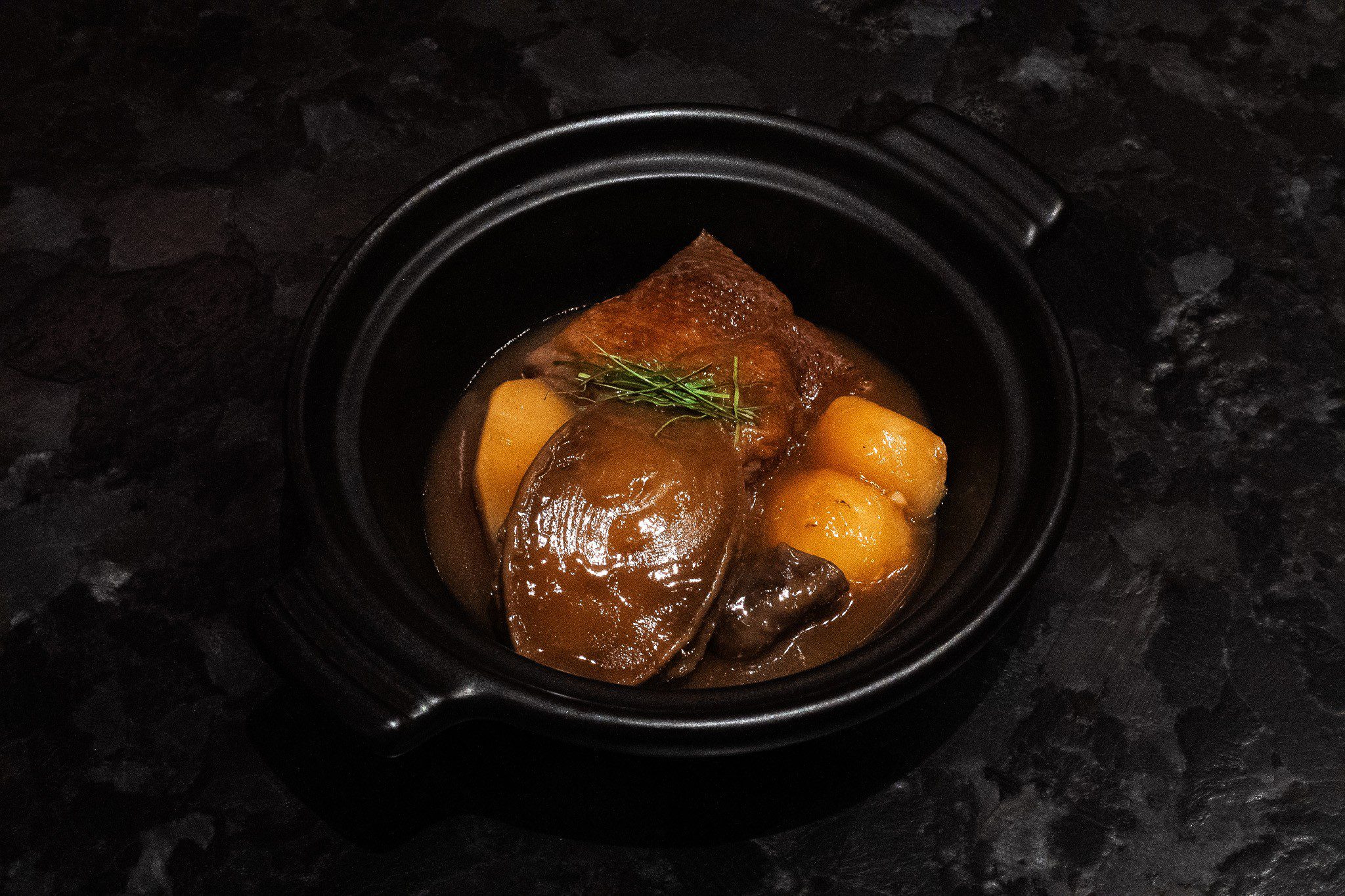 古法肥鵝炆中東乾鮑魚以傳統的「炆」法細火燜煮肥鵝,中東鮑魚是早年撈飯的主食材,經過一周煨好備用。肥鵝使肉質酥潤入味,油脂在慢火中緩緩釋放,散發濃郁香氣。待肥鵝完成初步燜煮後,再與頂級中東乾鮑、天白花菇,以及台南關廟嚴選的綠竹筍與荸薺一同入鍋,文火細煨,靜候時間淬鍊。此時,乾鮑獨有的鮮美與厚實滋味逐漸釋放,花菇幽然的清香、竹筍與荸薺的清甜爽脆相互交織,層層風味浸潤進鵝肉,使之豐潤飽滿,細膩而多變。肥鵝本身的油脂,如同溫潤的幕布,將鮑魚緊緊包裹,使其入口更加滑潤圓融。