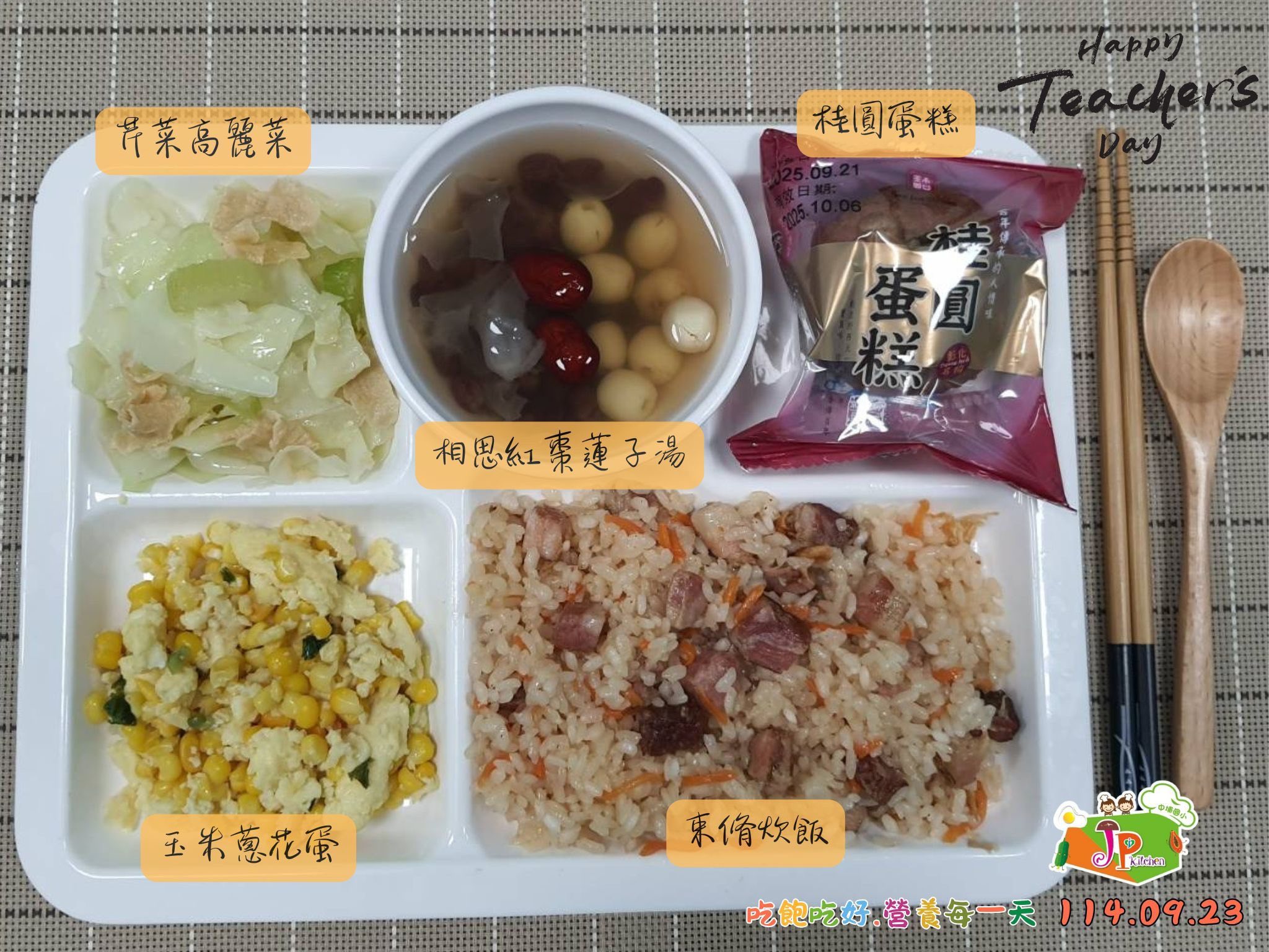 九月份適逢敬師月,嘉義縣中埔國小中央廚房發揮巧思,推出別具文化意涵的「束脩六禮餐」,讓學童在營養午餐中,體驗古代尊師重道的傳統禮儀,實際行動表達對教師的感恩教育。
