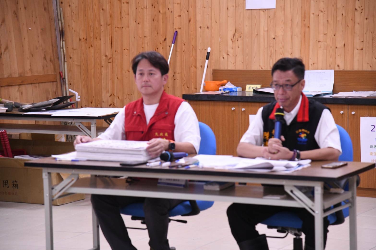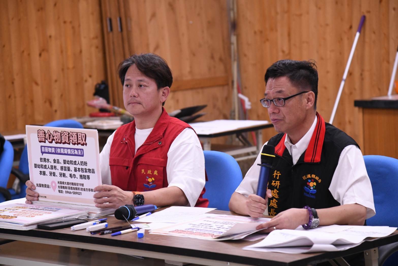 ▲花蓮縣政府行研處長陳建村(右)與民政處代理處長李葳(左)說明各項災後復原進度。(圖/縣政府提供)