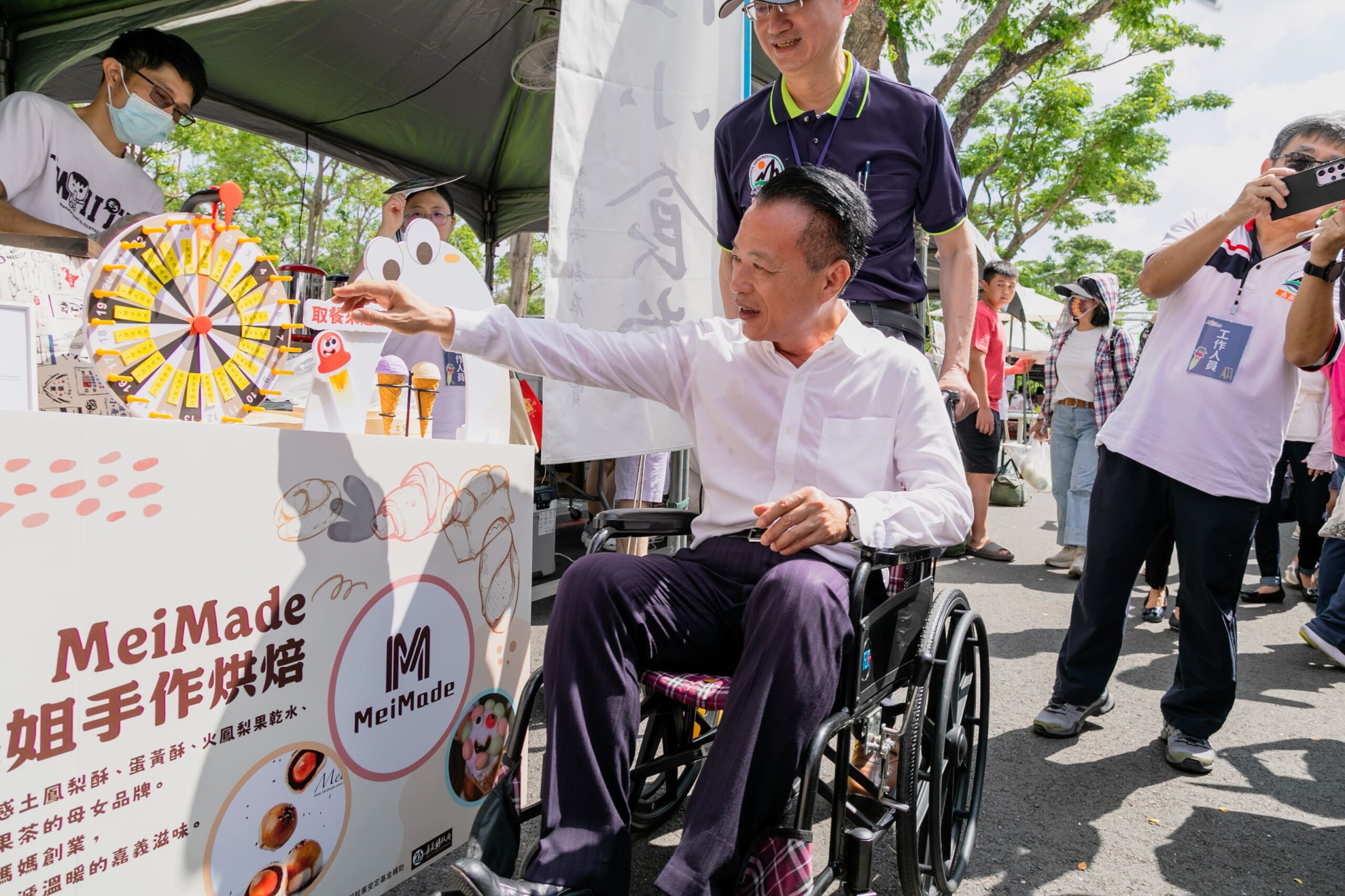 另一大特色是「友ㄞˋ小宇宙」身障友善服務專區,設置30個攤位,以通用設計與去標籤化理念,打造無障礙消費環境。視障者可透過嗅覺選購精油皂,聽障者能藉燈號辨識餐點,認知障礙者則能利用圖示卡牌理解餐點內容。翁章梁現場也親身坐上輪椅,體驗友善市集的便利性,並強調「身障友善必須融入日常,社會才能更理解與支持」。